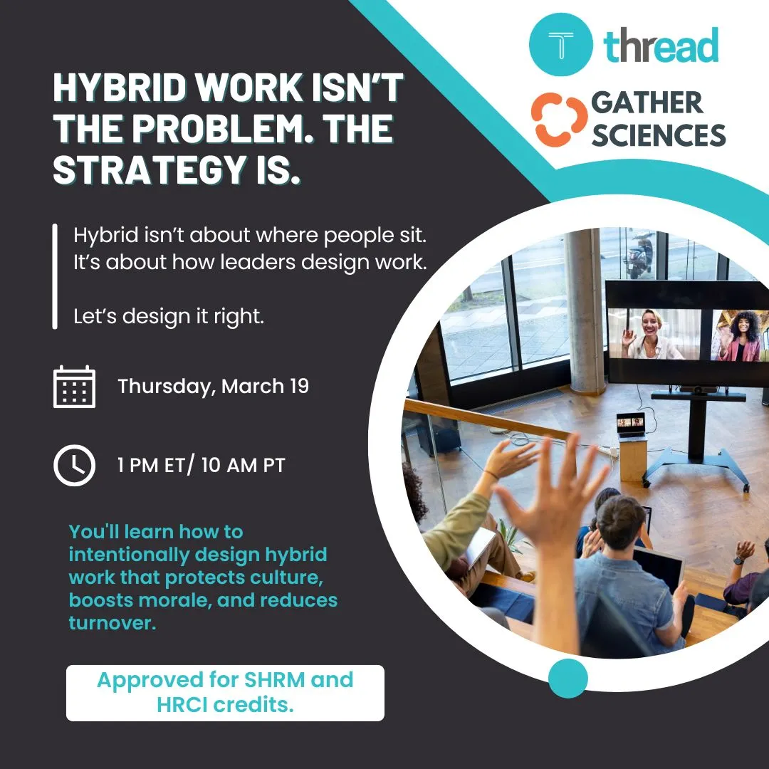 Join Thread and Gather Sciences for a practical conversation on how to intentionally design hybrid work in a way that protects culture, strengthens engagement, and supports long-term retention.